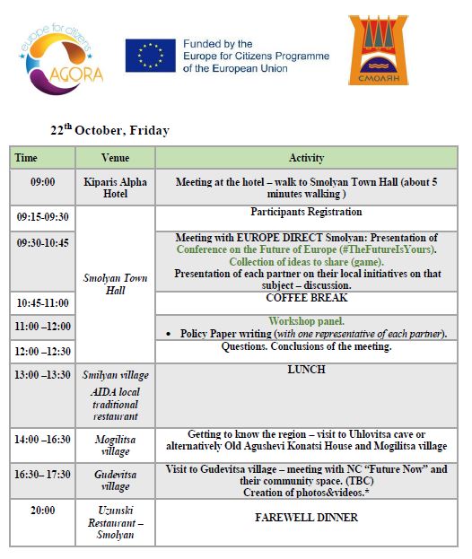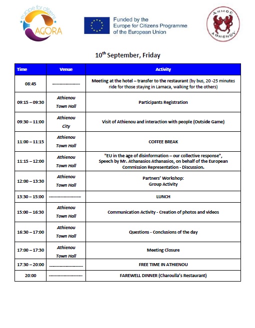 Young participants, local authorities, community and national press will be invited to attend the Closing Ceremony of the project. During the closing of the event, the outcomes of the project will be communicated to the public. A video, which will be produced during the project including moments, snapshots of all project activities, interviews and discussions, will also be presented to the attendants. After the ceremony, the partner representatives will participate in a follow-up meeting.